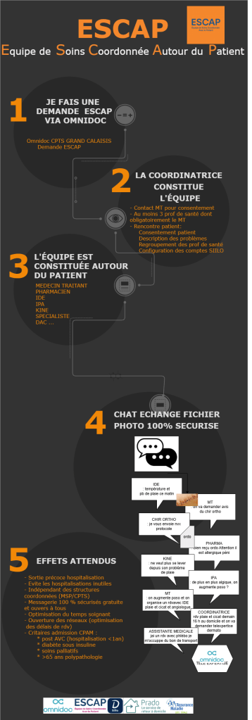 Complémentaire aux autres formes de coordination autour du patient, l’Escap permet à plusieurs professionnels de santé de se coordonner autour d’un besoin spécifique d‘un patient. Cette coordination assure le respect du libre choix de ses professionnels de santé par le patient.